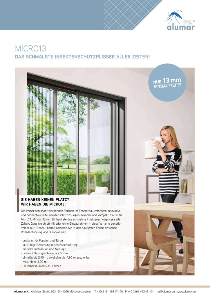 Kein Platz für herkömmlichen Insektenschutz? Probieren Sie das Micro 13 – das schmalste Insektenschutzplissee, das zu 95 % zwischen Rollladen und Blendrahmen passt. Ideal für große Durchgänge wie Schiebeanlagen oder Balkontüren, wo herkömmlicher Insektenschutz nicht passt. Mit vielen Farb- und Größenoptionen ist Micro 13 eine praktische und moderne Lösung.